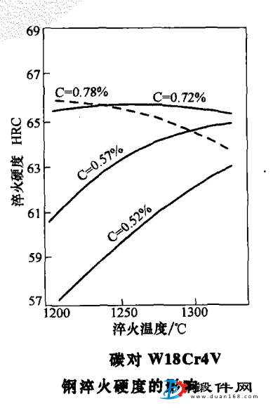 圖中示出碳對W18Cr4V鋼淬火硬度的影響。通過圖中曲線可以說明上面講述的內容。