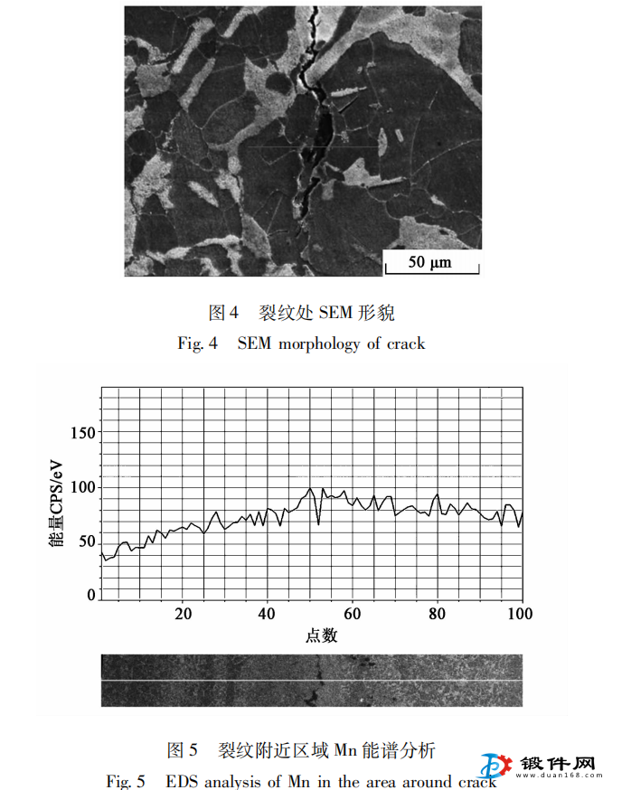 綜上所述 鍛件內部缺陷為斷續鋸齒狀的裂紋缺陷 根據EdS線分析 鋸齒狀裂紋均出現在鍛件微觀偏析帶內 微觀偏析條帶的存在使得鍛件局部區域硬度和體積變化率不同于周圍的正常組織 在熱應力 組織應力和變形應力的共同作用下 偏析條帶內易萌生裂紋 且在后續的鍛造和熱處理中逐漸擴展