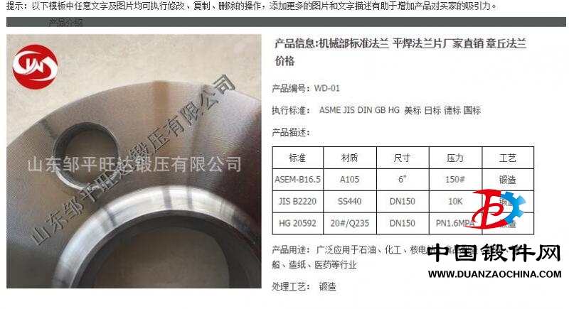 山東鄒平旺達鍛壓有限公司是一家專業生產法蘭的公司,公司主要生產美標、DIN、UNI、JIS、KS、BS、EN1092-1、SABS標準的法蘭,品種有高頸(WN).滑套(SO).承插(SW).搭接(LJ).盲板(BL).螺紋(TH).平板(PL)等等,規格從1/2”(DN15)---------60”(DN1500).并可承接用戶需要的非標法蘭和各種齒輪,軸類,模塊等鍛件.確保材質質量.在鍛造,車削.鉆孔.熱處理等加工工序上建立嚴格的質量保證體系,同時可以根據客戶圖紙生產各種特殊法蘭。公司成立于2005年,在鍛造行業有多年生產經驗,是一家固定資產過1500萬,年產量20000多噸的專業法蘭生產廠家。公司目前有生產工人200人,包括30名技術員工,我們將全力以赴的工作,為客戶提供高質量的產品。歡迎各位采購商與我們聯系。
